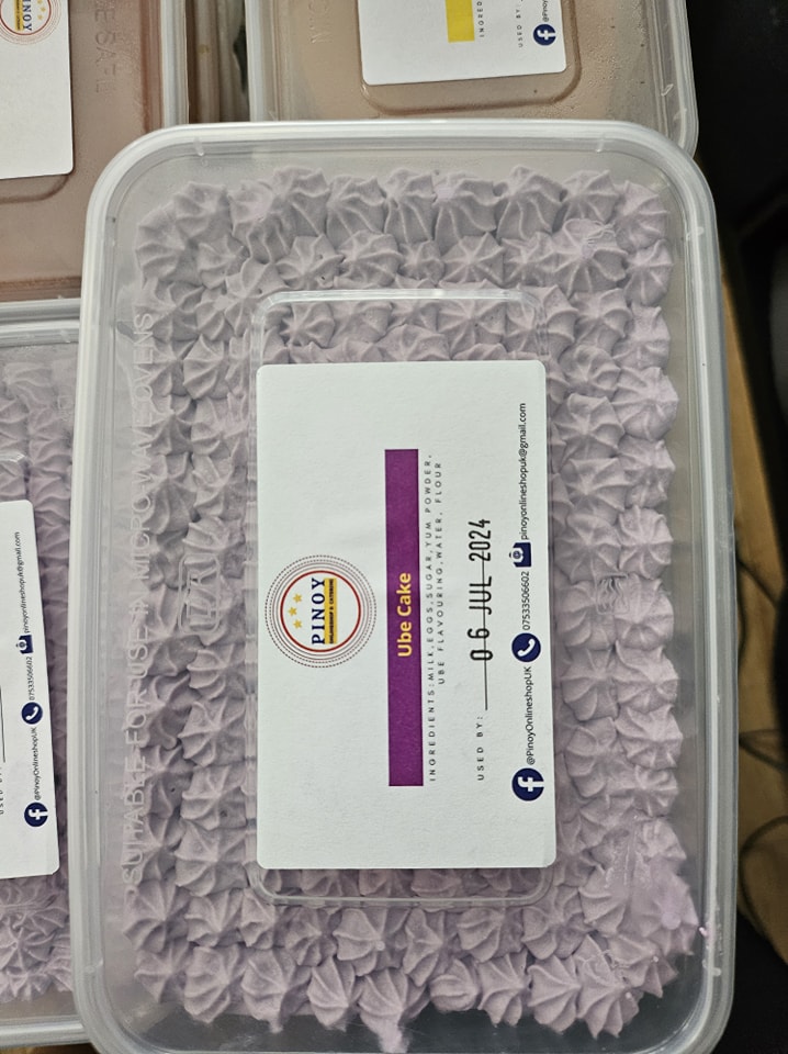 Enjoy moist, fluffy ube cake with creamy frosting, all conveniently packed in a tub for a sweet treat anytime!